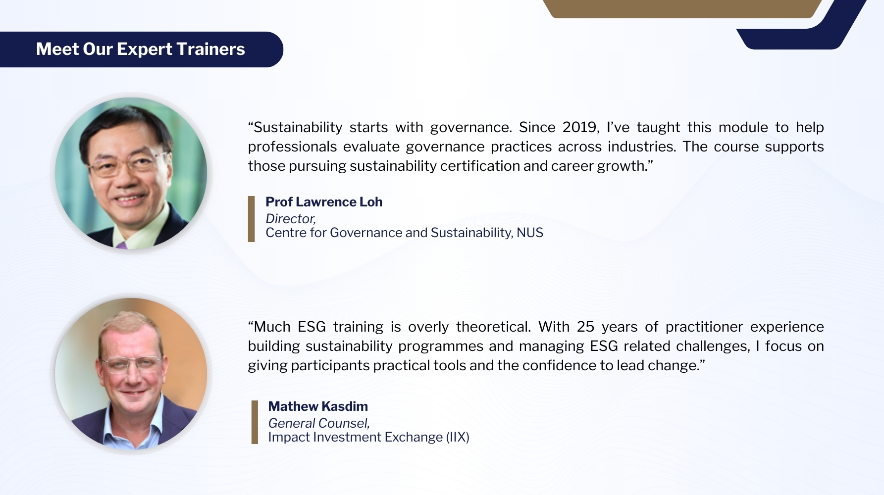 Professionals and business owners who are keen on deepening their skills and knowledge in corporate and business sustainability.