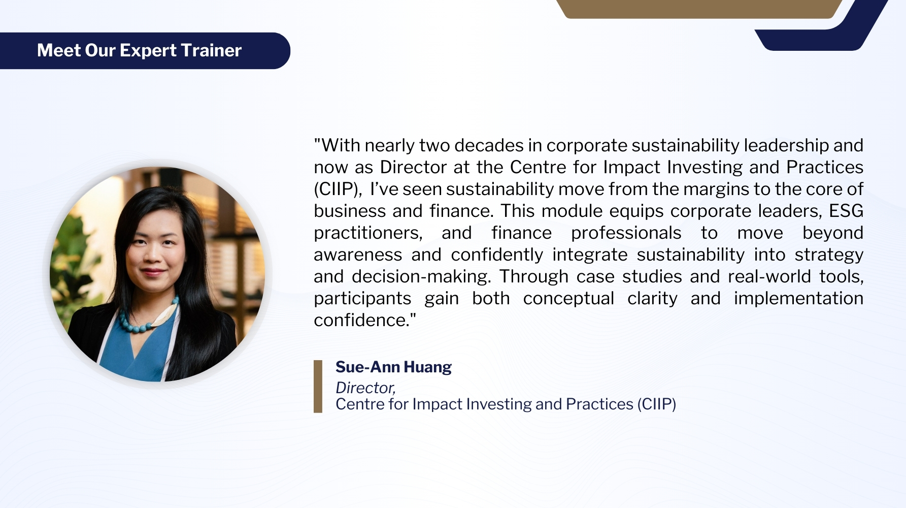 Thank you SMU Academy for the many wonderful learning experiences I received from your programmes. I have attended a number of sustainability programmes such as ESG & Materiality Reporting and the Certificate in Impact Investing and Mega Trends in Sustainability as well as the Advanced Certificate In Sustainability & Sustainable Businesses. Coming from an industry perspective, I have learned a lot and found the sustainability-related programmes by SMU Academy very useful. Through these programmes, I also got the opportunity to engage and network with various sustainability and ESG industry practitioners from Singapore and even Hong Kong. This is a major advantage for someone like me who is actively transiting from another specialisation into the sustainability/circularity field. Overall, the programmes are well-designed, with the content tailored to address real-world sustainability industry requirements and challenges. It has been a fruitful and enriching learning experience and I appreciate the wonderful industry sharing and learnings with SMU academy. I look forward to more sustainability programmes, especially sustainability finance programmes tailored for those without an advanced background in finance.