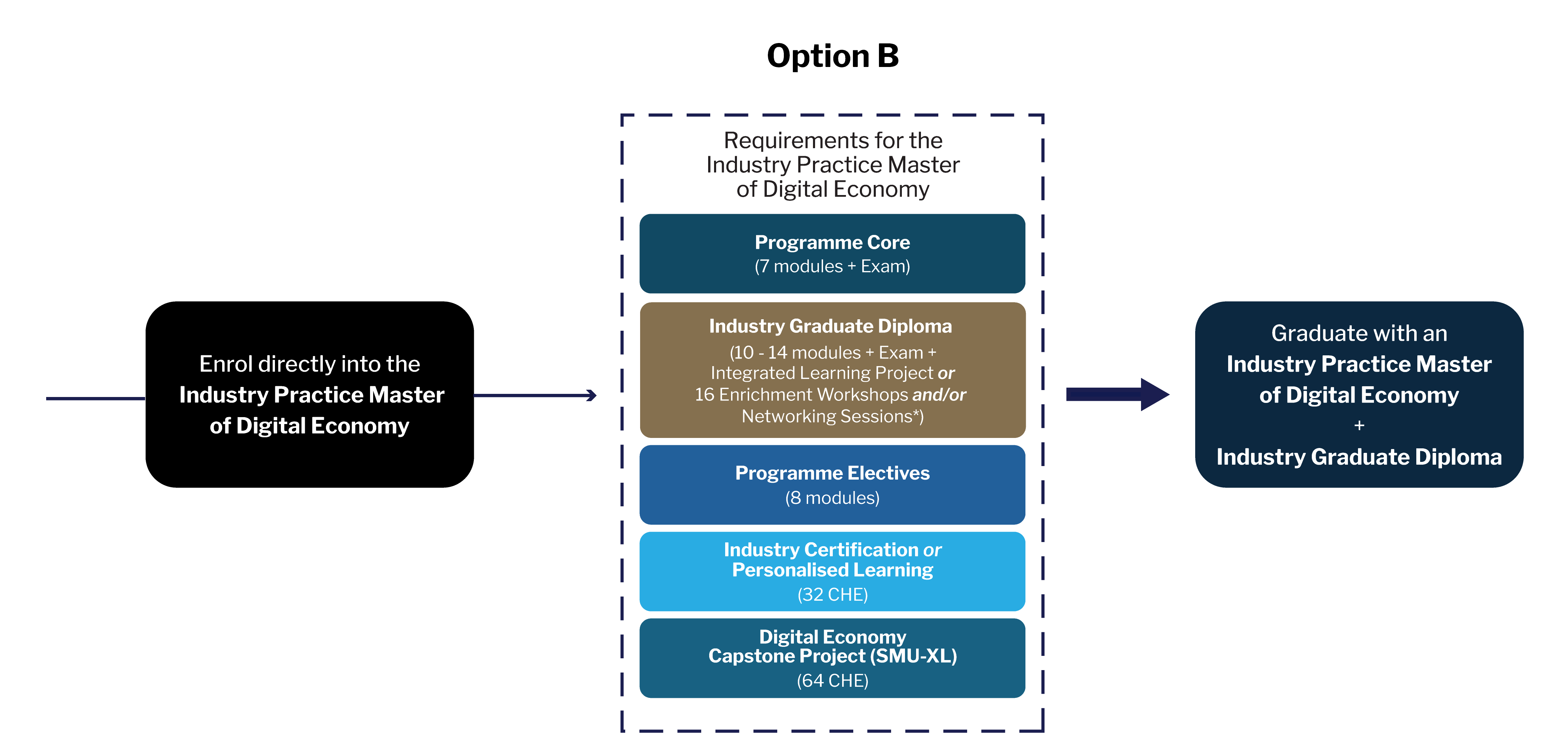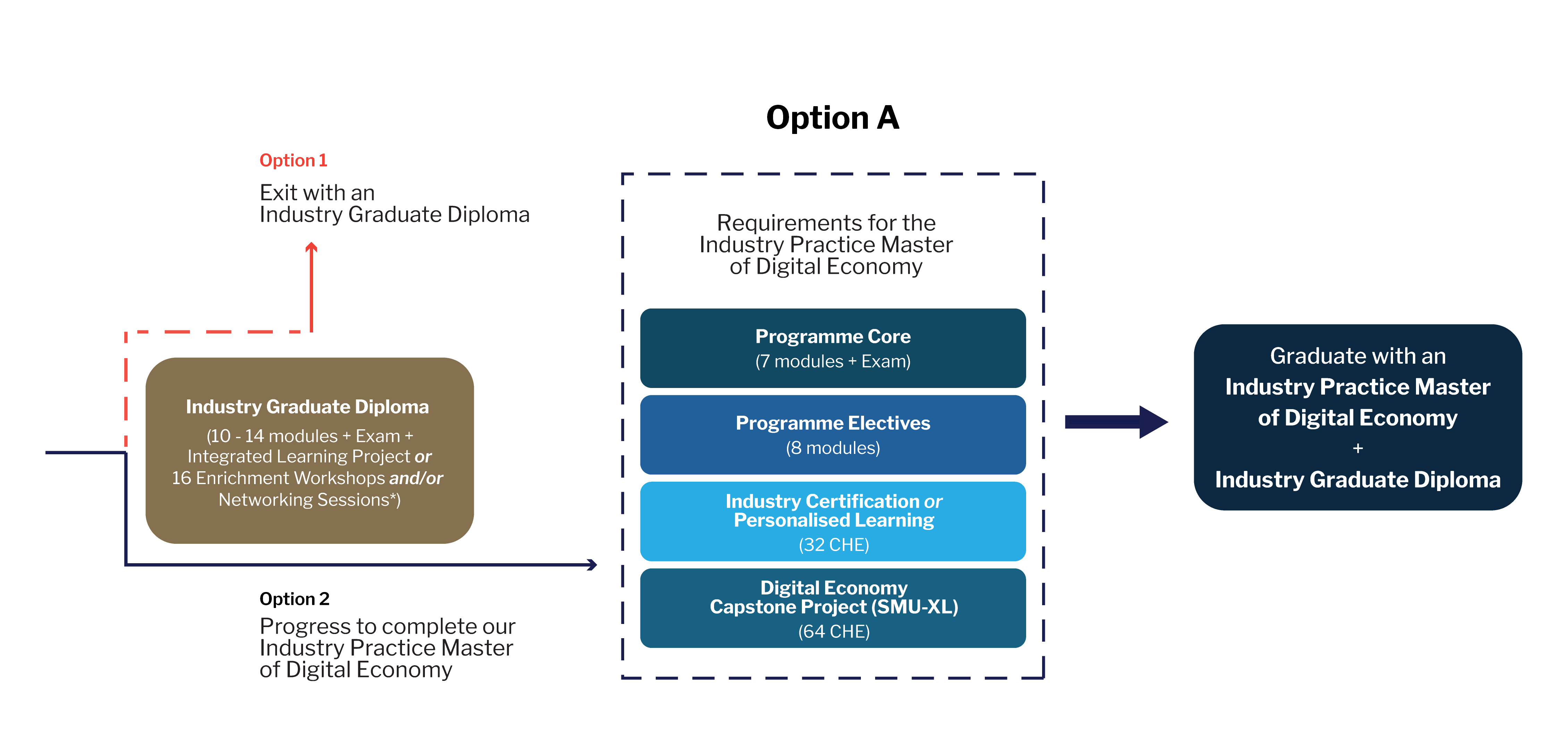 Option A allows participants to first achieve an Industry Graduate Diploma (IGD) by completing the curated set of modules and passing the IGD exam. For those who choose to deepen their learning further can work pursue the Industry Practice Master of Digital Economy (IPMDE), offering a flexible path to build expertise while balancing their professional commitments.