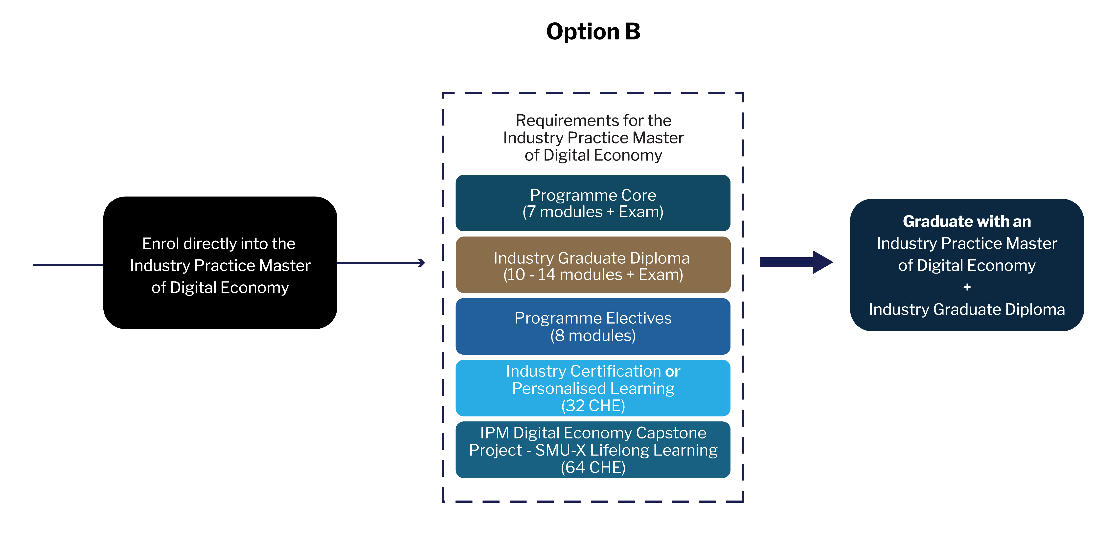 Option A allows participants to first achieve an Industry Graduate Diploma (IGD) by completing the curated set of modules and passing the IGD exam. For those who choose to deepen their learning further can work pursue the Industry Practice Master of Digital Economy (IPMDE), offering a flexible path to build expertise while balancing their professional commitments.