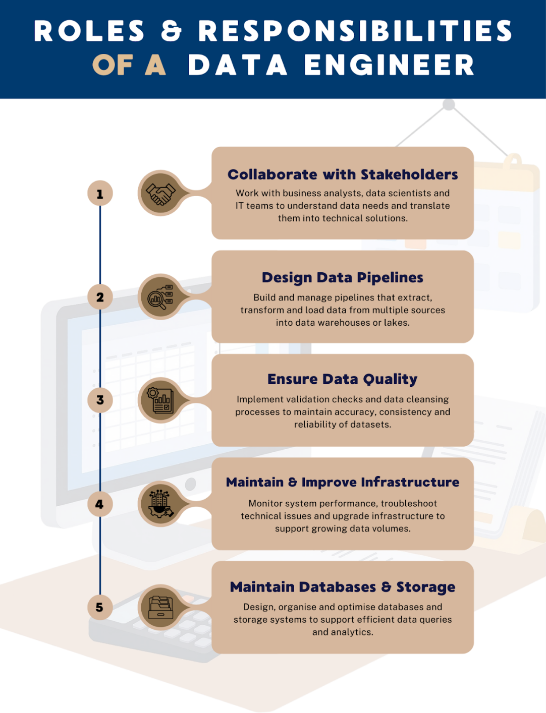 Data engineers design, build, and optimise databases and storage solutions to ensure data is organised for efficient queries and analytics.